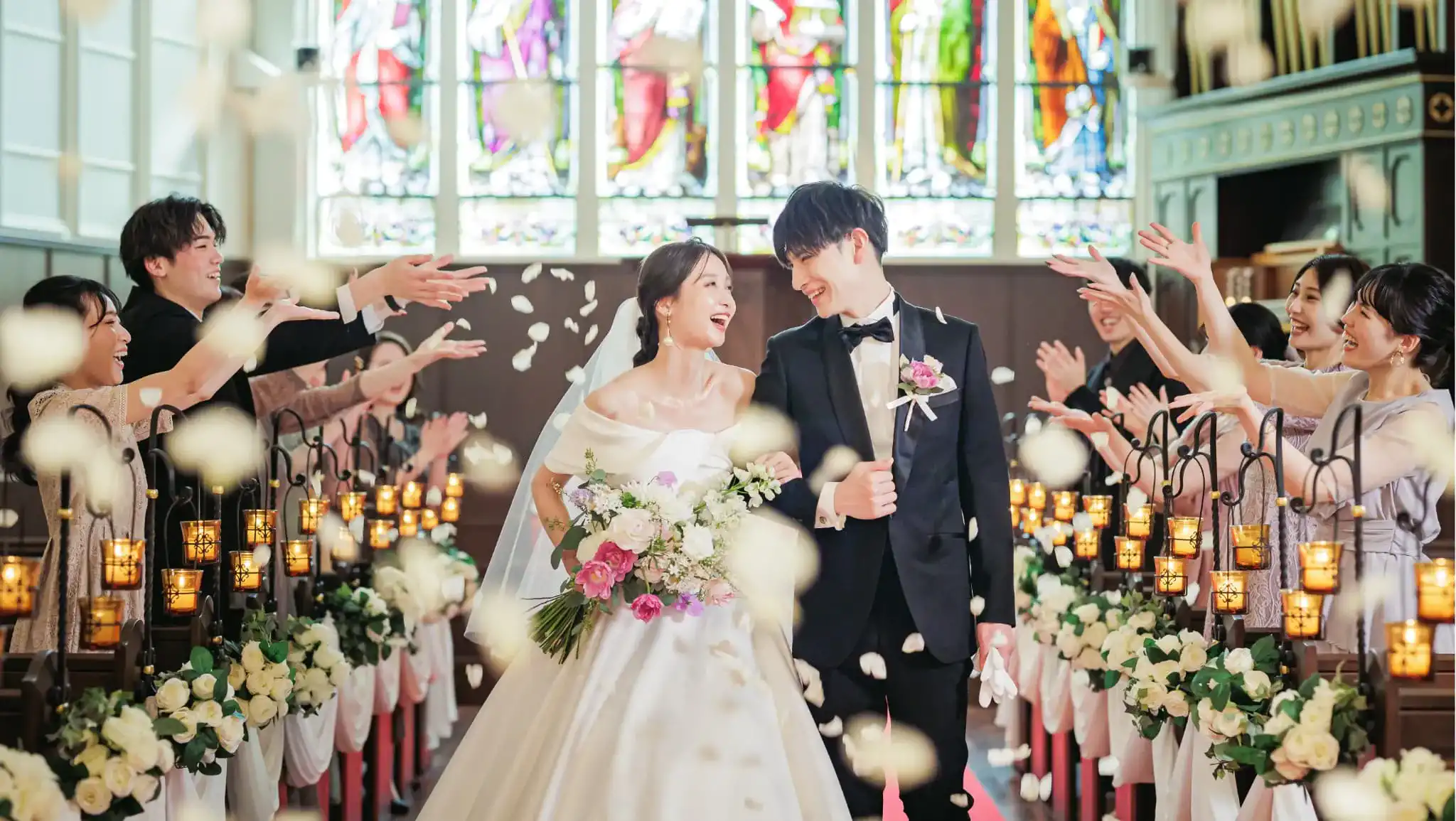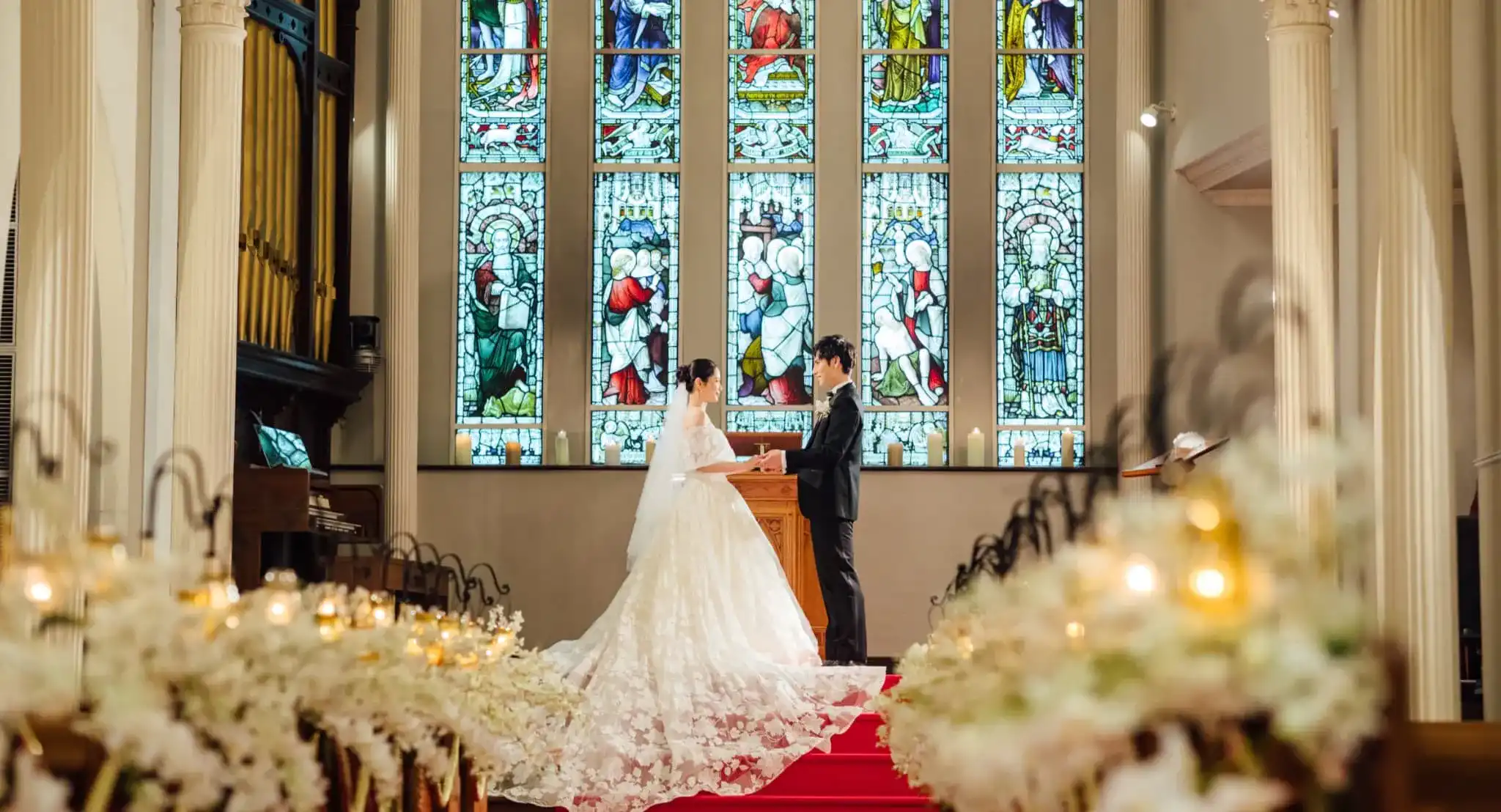 永遠に続く幸せを願い言の葉に紡ぐ牧師からのメッセージ。祈りを込めて歌う聖歌隊の賛美歌、パイプオルガンの荘厳な響きと、奏楽者による生演奏が聖堂の隅々にまで響きわたる。