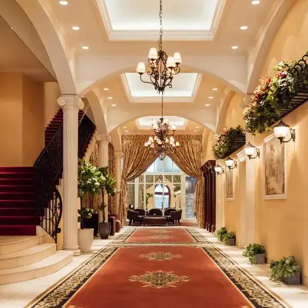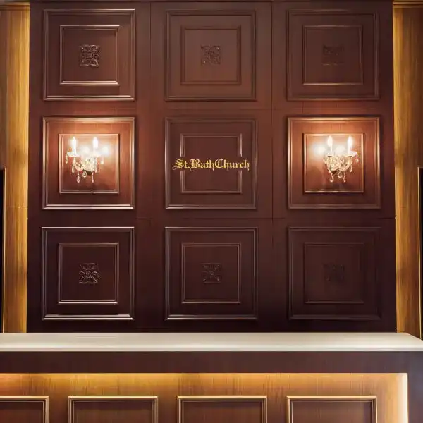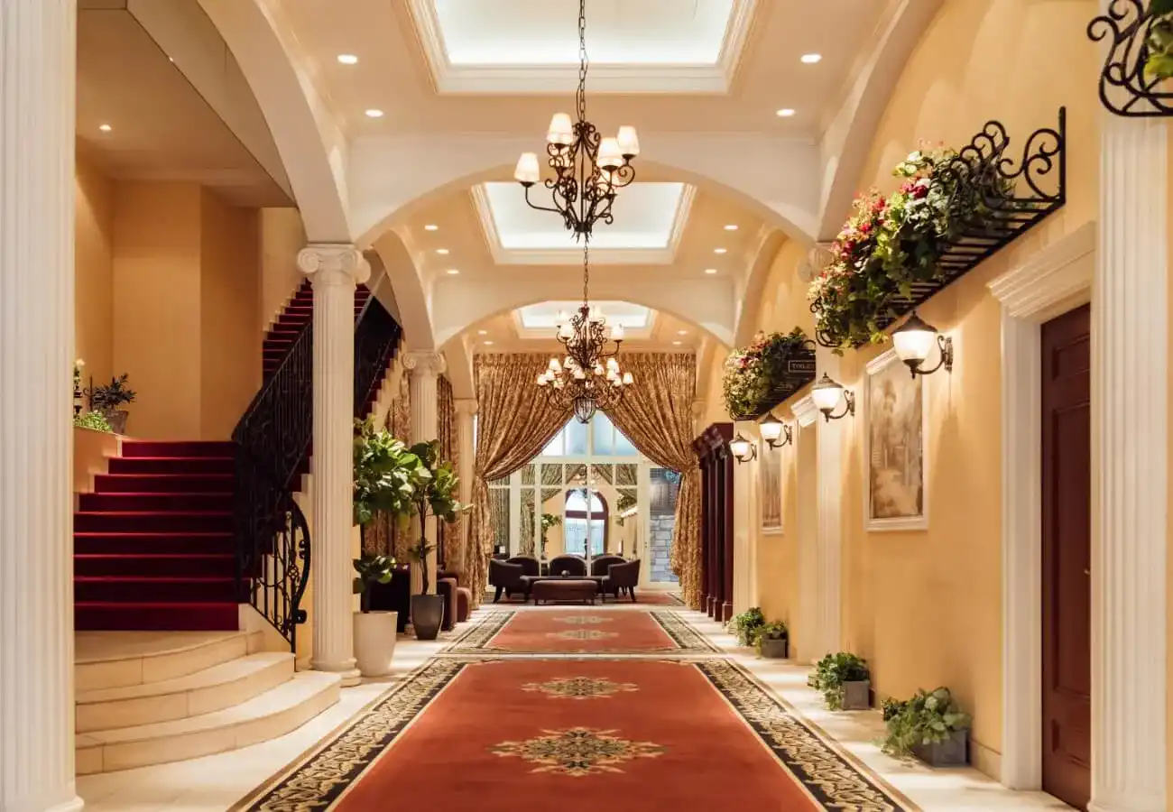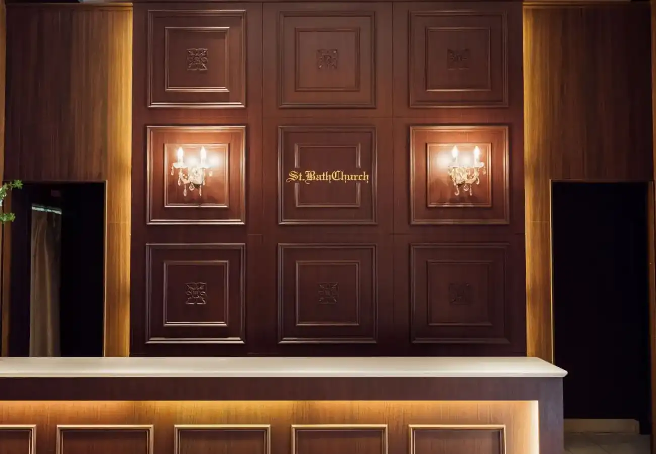 英国 Bath をモチーフにした、 アイアンのシャンデリアや落ち着いた家具でお出迎え。