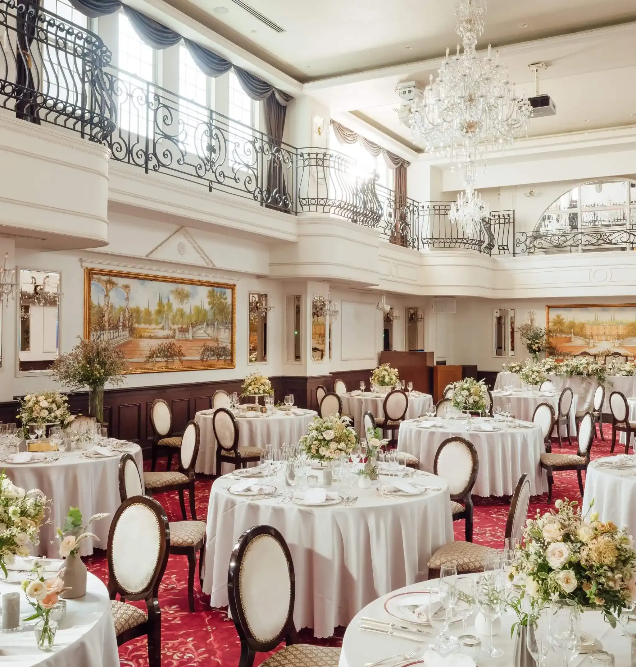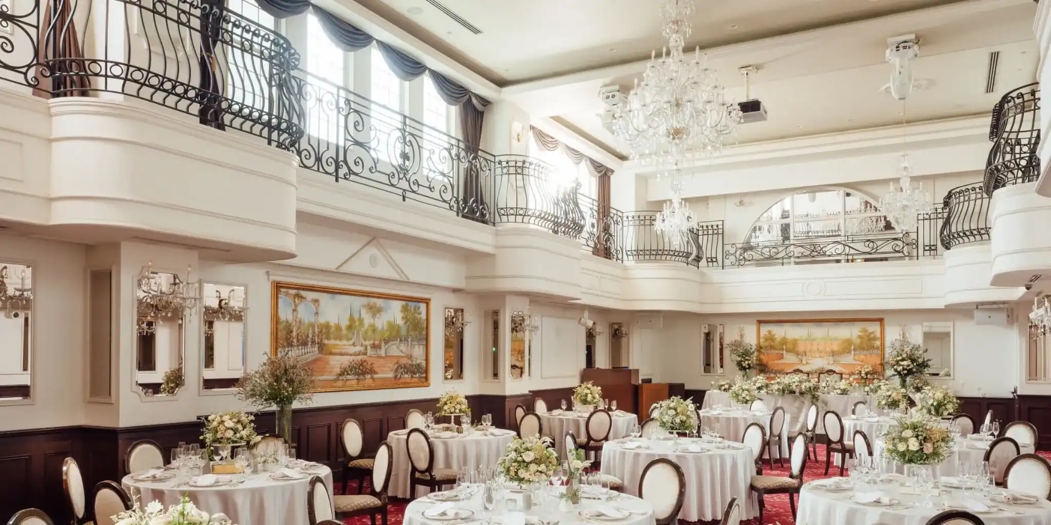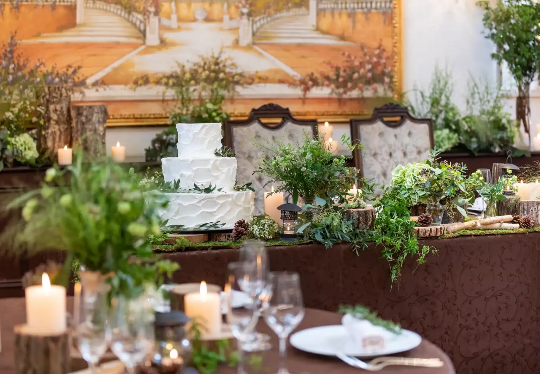 シャンデリアと木目調の壁がクラシカルで上品な雰囲気が漂うパーティースペース。 天井高は7mで開放感があり、大きな窓から差し込む自然光が祝福のひとときを一層輝かせます。大画面スクリーン・プロジェクターを常設しており多彩な演出提案が可能。 おふたりらしく自由に会場をアレンジいただけます。