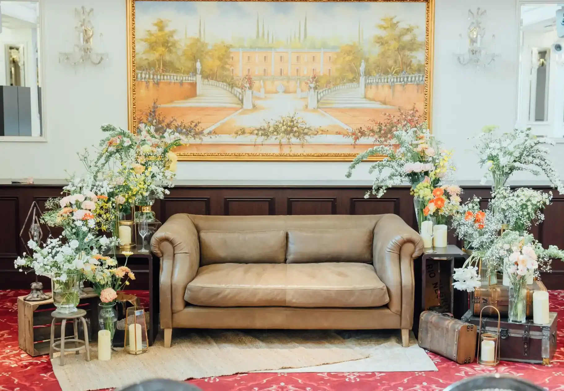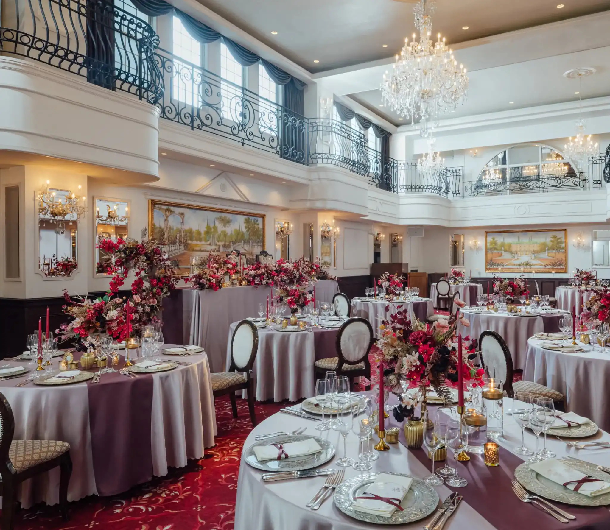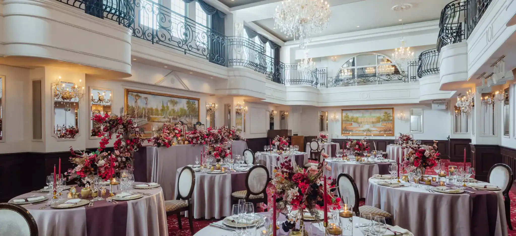 シャンデリアと木目調の壁がクラシカルで上品な雰囲気が漂うパーティースペース。 天井高は7mで開放感があり、大きな窓から差し込む自然光が祝福のひとときを一層輝かせます。大画面スクリーン・プロジェクターを常設しており多彩な演出提案が可能。 おふたりらしく自由に会場をアレンジいただけます。