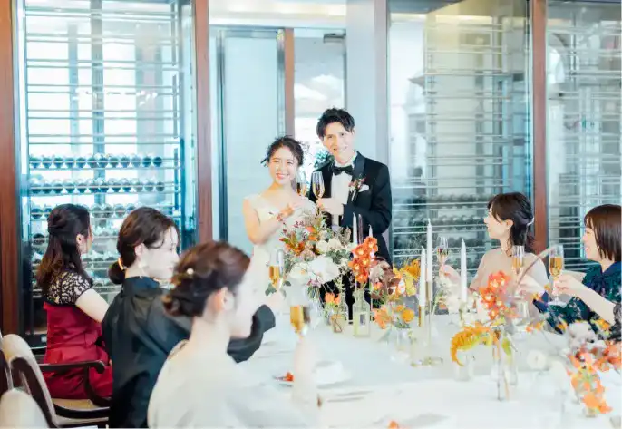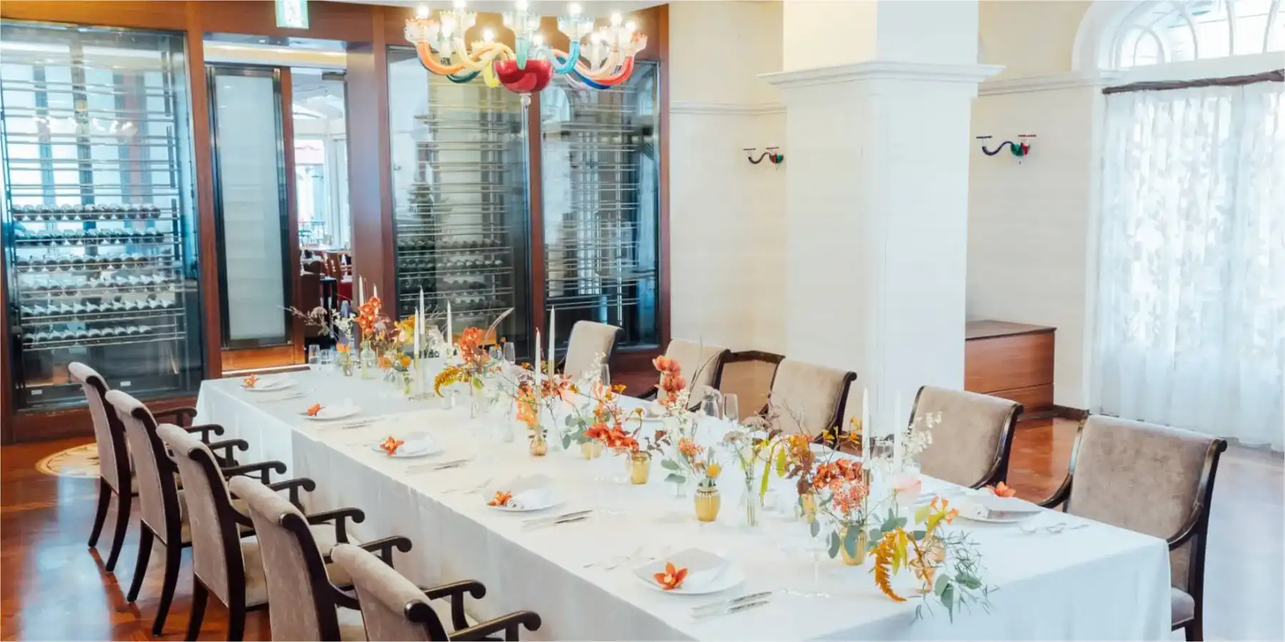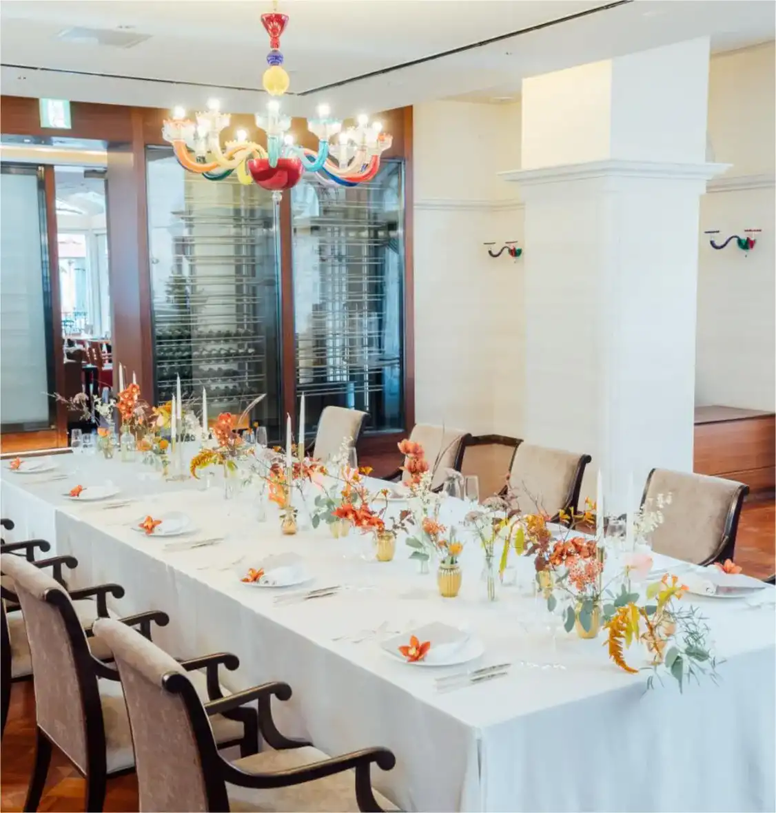 当教会に隣接するホテル1Fレストラン【Noeud.×THE CHEF’S◆2023年1月 NewOpen!】運営レストランで2年連続ミシュラン&グリーンスターW受賞★家族や大切な友人とだけで食事と歓談を愉しむ大人のパーティーが叶うレストラン。ご家族様だけのご会食、ご親族・大切なご友人様だけをお 招きした少人数パーティーに最適なプライベートで、時間も空間も贅沢に 貸切。「家族に感謝を伝えたい」「お食事をゆっくり楽しみたい」など、おふたりらしい想いが届けられる特別な空間。