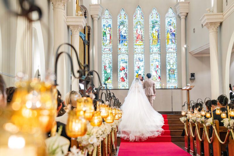 上品なウェディングドレスを美しく纏われた新婦様のバックスタイルが、